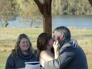 A few minutes into my welcome, I started to relax. I had asked the crowd to stand as the bride entered and I thought throughout the wedding, wow they are still standing. I jokingly told the groom to wake up when he paused too long for the ring exchange. Laughter ensued. I later told him there was only one thing left to do, and no he couldn’t leave, but rather kiss his bride. I remembered to speak articulately, loudly and slowly. And the people stood throughout. My son was in the back reaching his arms out to me so sadly, I had to not look at him.