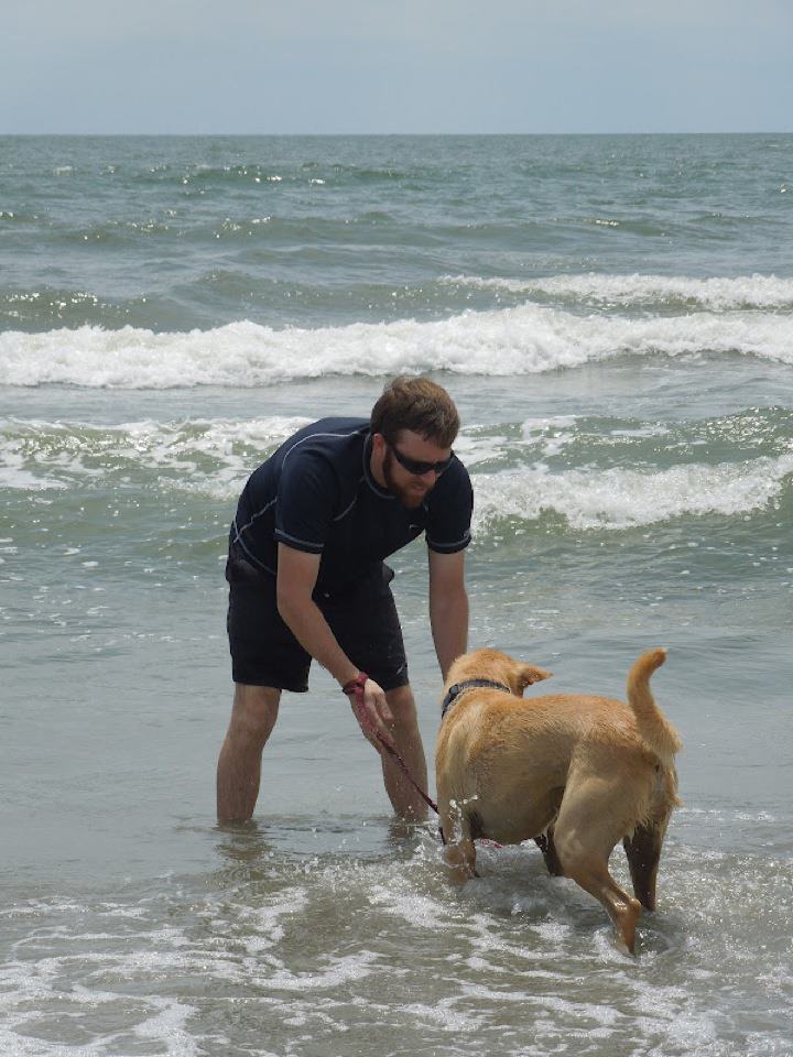 Grover developed quite the personality. He loved to play fetch and eat sticks and lick people. He loved trips to the lake where he was quite a swimmer. He also got to go to the beach and enjoyed that tremendously. He loved being out by the pool but never wanted to jump in. We weren’t sure why, since he loved the lake so much. Once, my mom and I were on floats and my dad and Sean went out to go tubing. Mom and I saw Grover start to swim out to us and assumed he’d turn around to swim toward shore. He then started swimming out further and further toward the boat. It was at least 50 yards. I was eight months pregnant and although I am a strong swimmer, I could not keep up. Finally, Grover swam at least 100 yards and I was worried he would tire to swim back. My dad had to turn around his boat to go back and get Grover. Back on shore he would dig holes, run up and down the beach lapping the waves and burying his tennis ball. He was in heaven (practically).