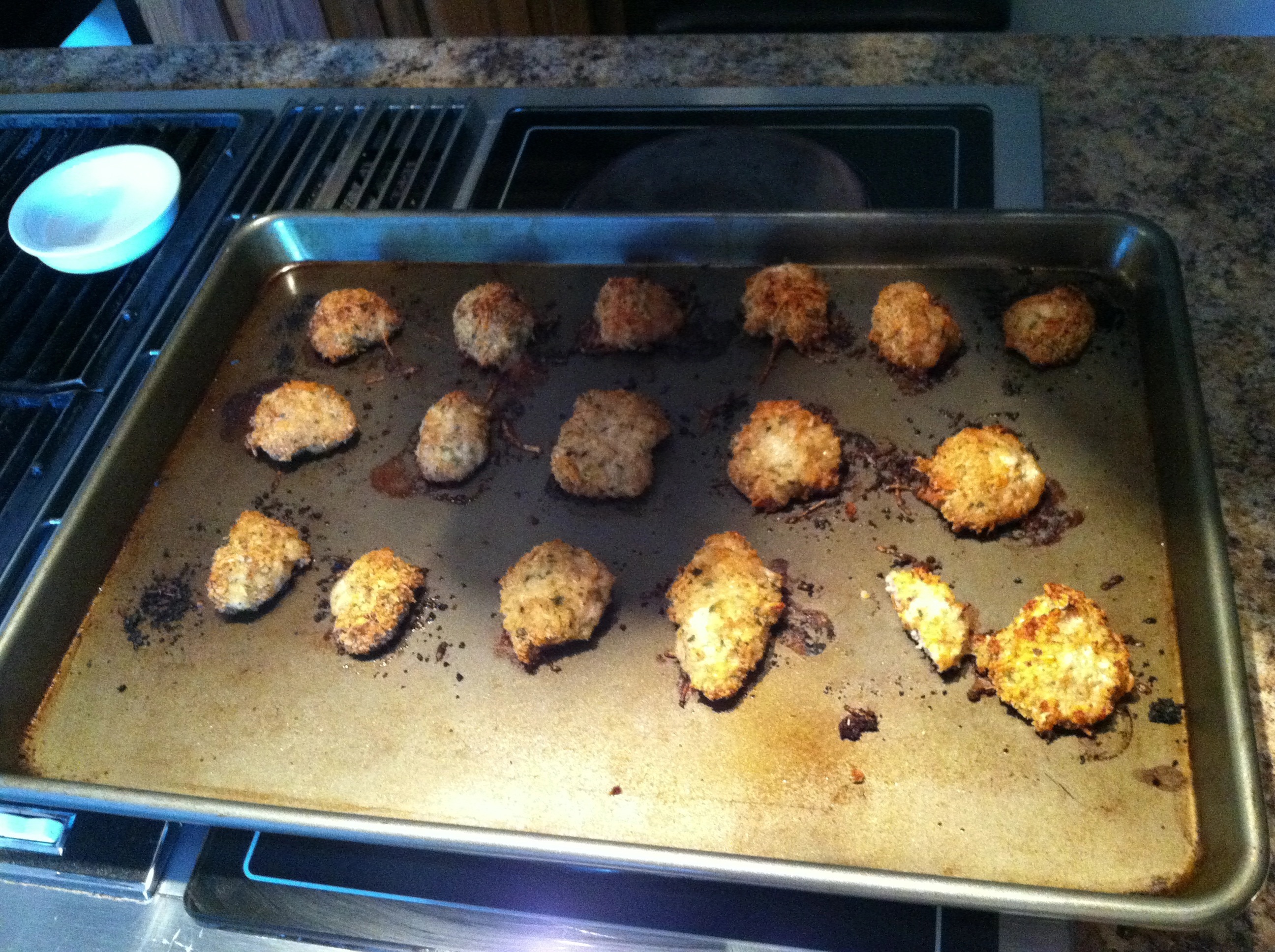 I made some homemade chicken nuggets, but with turkey and used a vegetable puree (carrots). I used ground turkey, pureed carrots, and dipped it into an egg/butter mixture then into a bowl of bread crumbs, basil, parmesan cheese, thyme, salt and pepper. Dip the nuggets from one bowl to the other and spray some olive oil cooking spray. Load up on 400 degrees for 20 minutes and voila!